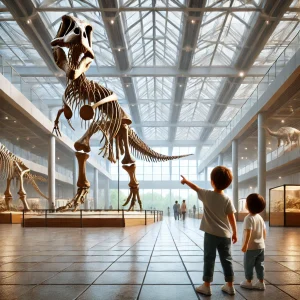恐竜の全身骨格展示が目玉の、理系キッズも大興奮な博物館。屋外には広い芝生広場や遊具もあり、ピクニック感覚でも楽しめます。